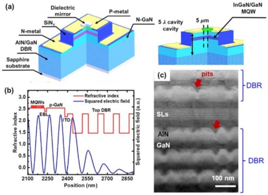 As aforementioned, III-nitride VCSELs are categorized into 2 types according to the combination of both end mirrors. The hybrid-type VCSEL possesses one mirror by epitaxial growth, and the other by dielectric deposition. The first demonstration is by T.C. Lu et al., and the schematic device structure is shown in Figure 5a,b. The device consisted of 29 pairs of AlN/GaN epitaxial DBR mirrors at n-side, 5λ-long GaN cavity with InGaN multiple-quantum-wells (MQW) at the anti-node, λ/8-thick ITO at the node, and 8 pairs of SiO2/Ta2O5 dielectric mirrors at top. Although short-period AlN/GaN superlattices (SLs) were inserted after every 5 pairs of AlN/GaN DBR to alleviate the strain energy accumulation, strain-induced defects were still observed. Figure 5c showed a transmission electron microscopy (TEM) image of an AlN/GaN DBR. The high density of surface depression (a.k.a. pits) was observed on the top surface of AlN only, which is attributed to the high tensile strain of AlN on the GaN templates. The pits with a central screw dislocation are strong carrier leakage paths. Therefore, the first nitride VCSEL can only be operated under low temperature to retain a high carrier density in MQW.