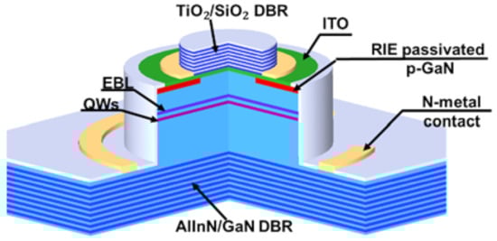 Therefore, the advancement of hybrid-type nitride DBR focused on circumventing the epitaxial strain. The most common approach is to replace the AlN with AlInN lattice-matched to GaN. According to Vegard’s Law, the Al% of lattice-matched AlInN is around 82%. However, the AlInN epitaxial growth is critical because the ideal growth conditions of AlN and InN are way apart, and its strain status is sensitive to the composition variation. Gas-phase reaction, surface pits, and phase separation were all reported for a single AlInN layer growth on GaN [64,65,66,67]. Besides, the optimal growth temperature of AlInN (Tg = 850 ~ 900 °C) also differed much from that of GaN (Tg = 1050 ~ 1100 °C). Therefore, improper treatment at AlInN/GaN growth interface could cause either In desorption or In segregation at the interface [68,69,70]. High reflectivity lattice-matched AlInN/GaN DBR was demonstrated early in 2003 as in ref. [71], but full VCSELs with lattice-matched AlInN/GaN DBR were not demonstrated until 2012. The schematic structure of the first nitride VCSEL with AlInN/GaN bottom DBR is shown in Figure 6 [21]. The large time gap between DBR and VCSEL demonstration might also be attributed to the significant challenges in the epitaxial growth integration. To date, the single VCSEL with the highest Pmax (>10 mW) utilized lattice-matched AlInN/GaN DBR. If the challenges in growth can be properly dealt with, nitride VCSEL array with epitaxial DBR is promising for high-power application [42].