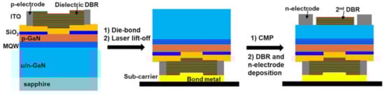Dual-type VCSELs possess deposited dielectric DBRs from both sides. The major challenge lies in the exposure of the bottom surface with a thickness precision. The first dual-type III-nitride DBR was demonstrated by Nichia Corp., and the schematic process route is illustrated in Figure 7 [11]. VCSEL epi was grown on sapphire or GaN and transferred to a sub-carrier via die-bonding and laser lift-off (LLO) or chemical-mechanical polishing (CMP) processes. To reduce the epi thickness to the target cavity length, the transferred epi was thinned via CMP. The process was critical for multiple reasons: (1) conventional LLO process is not applicable to GaN homoepitaxy. The GaN heteroepitaxy on sapphire has its limit in crystal quality. (2) Lack of feedback design to stop the CMP process. As the tolerance of cavity length error becomes narrow for short cavity lasers, residual thickness control will be extremely challenging. (3) The CMP still damages the epilayer near the surface. Restoring the electric contact characteristic requires other engineering efforts.