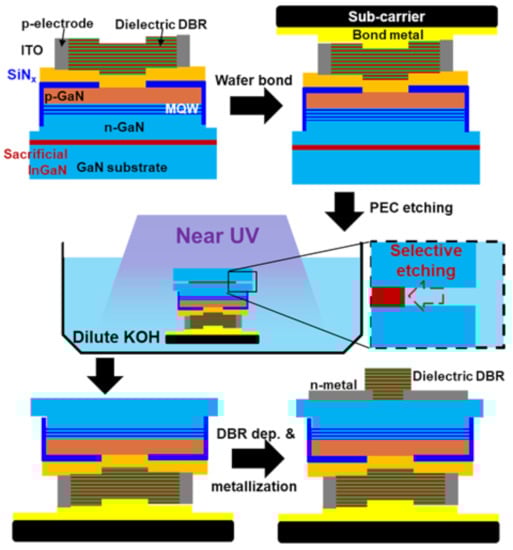 In 2015, Izumi et al. demonstrated dual-type DBR by epitaxial lateral overgrowth (ELOG) on pre-deposited dielectric DBRs as depicted in Figure 8 [35]. A 14.5-pair SiO2/SiNx DBR was deposited and patterned on the high-quality n-GaN substrate, and the n-contact was directly formed on the substrate backside. The rest of the device design and fabrication process on the top side is similar. Although the film coalescence and thickness control on the ELOG n-GaN could still be challenging, the crystal quality and the backside contact characteristics were significantly improved. Figure 9 demonstrated another potential route for defining the cavity length with photoelectricalchemical (PEC) etching [76,77,78]. Prior to the device epitaxy, an InGaN sacrificial layer with a near-UV bandgap (λ = 385 nm ~ 405 nm) was grown on a bulk GaN substrate. After a similar VCSEL process was done from the top side, another deep-etch was performed to expose the sidewall of the sacrificial layer. The wafer was then bonded to another sub-carrier. Under near-UV illumination, only the sacrificial layer dissolves in KOH solution. After the sacrificial layer was completely etched, devices were transferred to the sub-carrier with a well-defined cavity length and were ready for the processes at the backside. Electrically pumped PEC-transferred III-nitride VCSEL was first demonstrated by C. Holder et al. and was continuously improved in the same affiliation [44,45,46,47,48,49,50]. In comparison with the ELOG-DBR stack with a micrometer in height and ~10 micrometer in width, cavity length control with a planar sacrificial layer is much less critical. However, the PEC etching rate could be still limited by the carrier and materials transport after the undercut goes deep; passivation of the device epi is also essential for the yield.