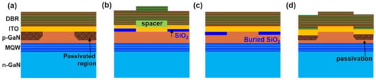 To overcome the anti-guiding effects due to the deposited dielectric aperture, the optical path difference between the central region and cladding region needs to be compensated. An intuitive approach is to get rid of the dielectric mirror by passivating the cladding region by ion-implantation or plasma treatment. The schematic aperture design was shown in Figure 10a [37,38,43,45,49,50,51]. As a result, the vertical optical path between mirrors in both regions is identical. One could also enhance the optical path in the central region with an additional spacer as depicted in Figure 11b [79], or etch some p-GaN off in the cladding region as shown in Figure 10c,d [39,40,41,42,43]. If the optical path in the central region becomes longer than that of the cladding region instead, the lateral optical confinement alters from anti-guiding to guiding. Figure 10c,d both etched some p-GaN off, but (c) still adopted a dielectric layer to block the current (buried aperture) while (d) directly exploited the plasma-damaged surface as the carrier aperture. From the perspective mirror curvature, the original dielectric aperture yielded a concave-like mirror, aperture in Figure 10a yielded a planar mirror, and designs in Figure 10b–d yielded convex-like top mirrors.