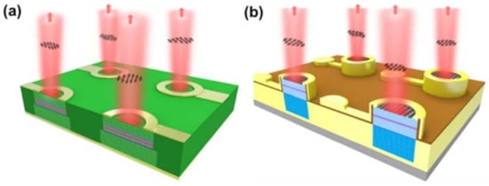 Forming a VCSEL array is the most cost-effective way to push the Pmax up to another order. Unlike the TE-mode lasing is strongly preferred in EELs, the polarization in the VCSEL array on the basal plane is random as shown in Figure 11a. If the applications require lasing in specific polarization, for example, holographic projection and polarization-multiplexing in visible communication, the final device output power will be reduced in half after including an external linear polarizer. Therefore, polarization control is also an interesting topic for VCSEL applications. Although manipulating the polarization to an arbitrary angle is difficult, it is possible to restrict polarization in the VCSEL array in the same direction as depicted in Figure 11b.