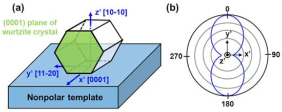 - You, S.; Detchprohm, T.; Zhu, M.; Hou, W.; Preble, E.A.; Hanser, D.; Paskova, T.; Wetzel, C. Highly Polarized Green Light Emitting Diode inm-Axis GaInN/GaN. Appl. Phys. Express 2010, 3, 102103. [Google Scholar] [CrossRef]