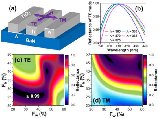 The selected grating structures with Λ from 365 nm to 385 nm in Figure 13b were summarized in Table 4. With a proper design, R > 99% with ~20 nm bandwidth could be achieved. Figure 13c,d plotted the reflectivity mapping with varying Fw and Fh under Λ = 375 nm and λ = 410 nm. Because the boundary conditions between TE-mode and TM-mode are different, the parameter design space for high reflectance also differs. If the combination of (Fw, Fh) only gives a high R to one polarization mode, the other polarization will be discriminated for lasing. For example, if (Fw, Fh) in Figure 13c,d is (30%, 28%), R for TE-mode exceeds 99% while R for TM-mode is less than 40%. As a result, TE-mode lasing prevails.