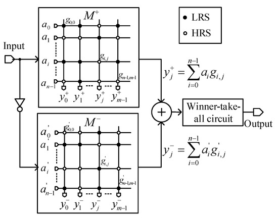 The twin crossbar architecture, which employs two identical arrays, has been proven to have the same functionality of the complementary crossbar architecture for image recognition [15]. The architecture of the twin crossbar is conceptually shown in Figure 2.
