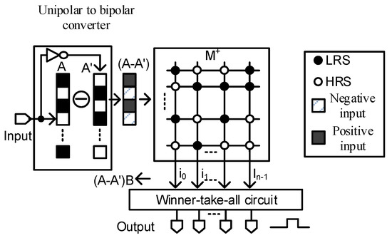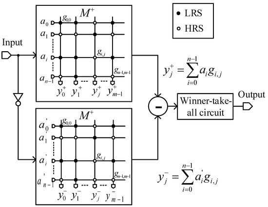 A complementary crossbar architecture consisting of two complementary crossbar arrays for pattern recognition is depicted in Figure 1. Here, and − represent the memristor crossbar and its inversion, which consists of inverted elements of , respectively.