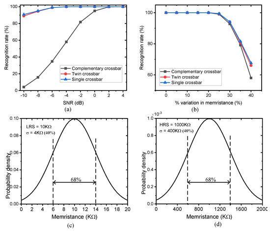 Memristance variation is one of the problems that degrade the performance of memristor crossbar-based applications [17,18,19,20,21]. In this work, we also compared the performance of the complementary architecture, the twin architecture, and the single crossbar with bipolar input with respect to the variation of memristance. In this simulation, the percentage of memristance variation was varied from 0% to 40%. Figure 7b compares the recognition rates of the complementary architecture, the twin architecture, and the single crossbar with bipolar input when the percentage of variation in memristance was increased from 0% to 40%. In the simulation, Gauss distribution was used for memristance variation, as shown in Figure 7c,d. LRS and HRS were assumed to be 10 and 1 MΩ, respectively. As shown in Figure 7c, for LRS, the percentage of variation was 40%, meaning the memristance value varied from (μ − σ) to 14 (μ + σ) kΩ with the probability of 68%. As shown in Figure 7d, for HRS, the percentage of variation was 40%, meaning the memristance value varied from 600 to 1400 kΩ with the probability of 68%.