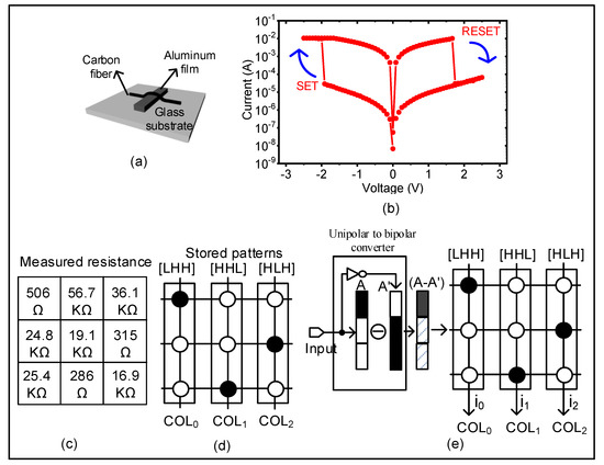 The simulation results showed that the single crossbar array well tolerated input noise and memristance variation, in addition to saving area and power consumption. In the last part of this work, we carried out an experiment to study the performance of the single crossbar array for pattern recognition. The performance of the single crossbar array was tested on a fabricated memristor crossbar in which each crossing point was formed by a single memristor made of carbon fiber and aluminum film, as shown in Figure 8a [22]. The carbon fiber was placed on top of the thermally evaporated aluminum film as in a stripe pattern. The fabrication process was as follows. First, aluminum (Al) wire with 100 nm thickness was evaporated on a glass substrate with a 1 mm thickness. Then, a carbon fiber with 5–10 µm diameter was placed on the patterned aluminum film. The carbon fiber and aluminum film acted as the top and bottom electrodes, respectively [23]. Figure 8b shows the switching behavior of the fabricated memristor, where the applied voltage was swept from −2.5 to 2.5 V and vice versa. For the positive sweep, SET-to-RESET switching was found around 1.7 V, as shown in Figure 8b. For the negative sweep, RESET-to-SET switching was observed around −1.8 V. Figure 8c presents the measured memristance of the fabricated 3 × 3 memristor crossbar. The crossbar with measured memristance was used to store three patterns of [LHH], [HHL], and [HLH], as represented in Figure 8d. Figure 8e shows the conceptual diagram of the single crossbar for recognizing three patterns. The input was bipolar and was generated from the raw input and its inversion, as indicated in Equation (7). Here, the column lines , , and represent the similarities between the input pattern and the patterns stored in the first, second, and third columns, respectively.