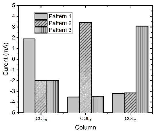 When the bipolar vector of the [HLL] pattern was applied to the crossbar, the column current was as high as 1.9 mA, whereas the column and produced negative column currents. The obtained column current, in which was the maximum current, indicated that the first column was the best match to the input pattern. Similarly, when we applied the bipolar vector corresponding to the pattern of [HHL], the column current was as high as 3.4 mA against the negative current of , and , as shown in Figure 9. Moreover, the column had the largest current when the bipolar vector of the pattern [HLH] was applied to the crossbar. The measurement results shown in Figure 9 experimentally demonstrate that the single crossbar performed the task of pattern recognition well based on the operation of the XNOR as presented in Equation (7).