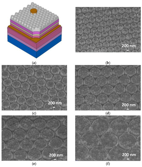 In the experiments, a 2-inch LED wafer was divided into six parts to prepare the samples. Sample A was a conventional LED, which acted as a reference device. Samples B, C, D, E, and F were fabricated nanopillar arrays with various lattice constants of about 600, 800, 1000, 1200, and 1600 nm, respectively. Figure 1a presents the schematic of the complete structure of GaN-based LEDs with periodic nanopillar arrays on ITO layer, and Figure 1b–f, respectively, shows the ITO nanopillar array morphologies in samples B, C, D, E, and F.