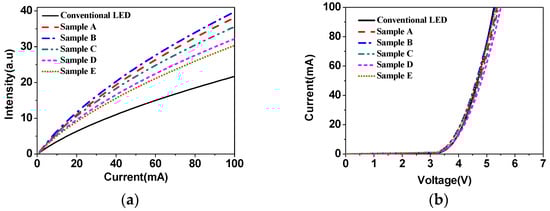 Electroluminescence curves of five nanopillar patterned LEDs and the conventional LED. (a) The light output intensity versus injection current (L-I) characteristics. (b) Current versus voltage (I-V).