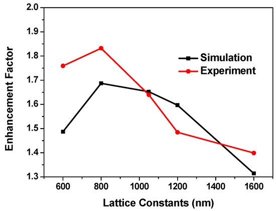 To determine the effect of diffraction, we also calculated the integrated transmission over the whole incident angle θ and azimuth angle φ for lattice pitches from 600 to 1600 nm for the structures in the experiments. We first integrated the transmittance of the reference sample as unity. The curve with square dots in Figure 5 shows the calculated enhancement factors of the TE-polarized integrated transmission efficiency versus the lattice pitch. The trend of the curve is basically consistent with Figure 3. The enhancement factor reached the maximum as the lattice constant was 800 nm. However, the enhancement factors were relatively small compared with those in Figure 3. In the simulation, the transmission angular spectrum did not consider the multireflection by the lower interface between GaN and sapphire substrate. The transmission below the critical angle was lower compared with the reference LED, which resulted in some extra light being diffracted back into the LED. However, the back-diffracted light can be reflected by the back of the LED and then re-extracted by the structures [30]. In addition, there was transmission beyond the critical angle. Although the transmission was not high, this indicates that the light beyond the critical angle can also increase the escape of light through multiple reflections.
