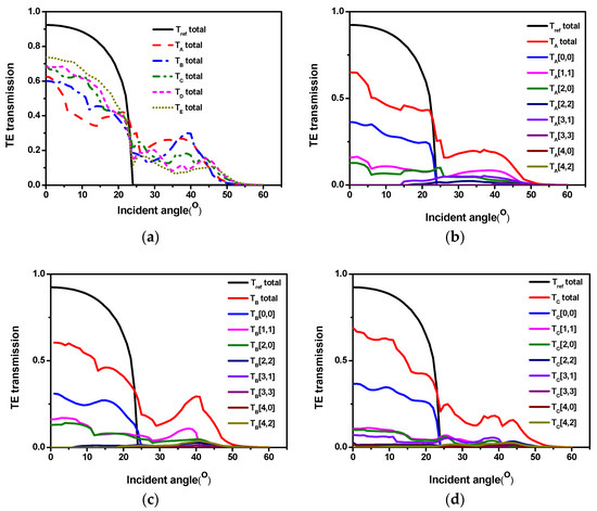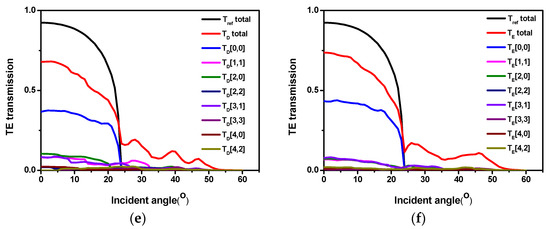 The curves of “Tref total” are the transmissions of a conventional planar LED in each figure as a reference. The curves labeled by T (m, n) represent the transmissions with the diffraction order of (±m, ±n), and the curves of “T total” are the sum of the whole diffracted transmission. The curve T (0, 0) corresponds to the direct transmission from ITO to air. In this paper, the minimum period was 600 nm, which is much larger than the critical pitch (acrit = λ/(1 + neff)); therefore, the component of higher-order diffraction appears in Figure 4b–f. The transmissions of T (0, 0) increased with the increase in the lattice constant. As a result, the total angular transmissions will be relatively high in the critical angle range. In addition, generally speaking, with the increase in the lattice constant, the diffraction order will also increase; however, we found that the diffraction energy did not increase, which meant that the relatively high period of higher-order diffraction energy was not obvious. Therefore, for a relatively good nanostructure, a relatively high transmission at all angles is preferred, and this provides a basis for us to design nanostructures.