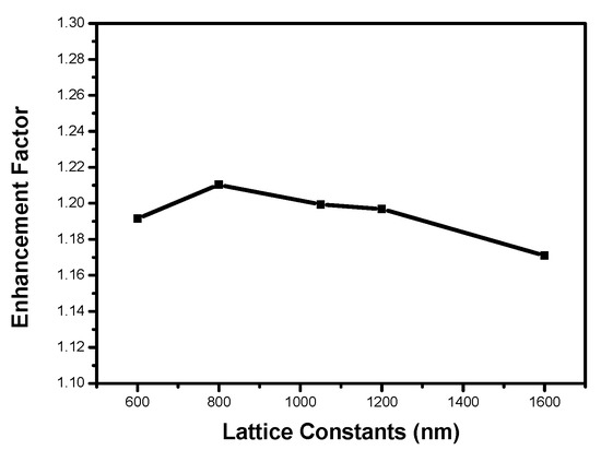 The calculated enhancement factors of the TE-polarized integrated transmission on the lattice constant.