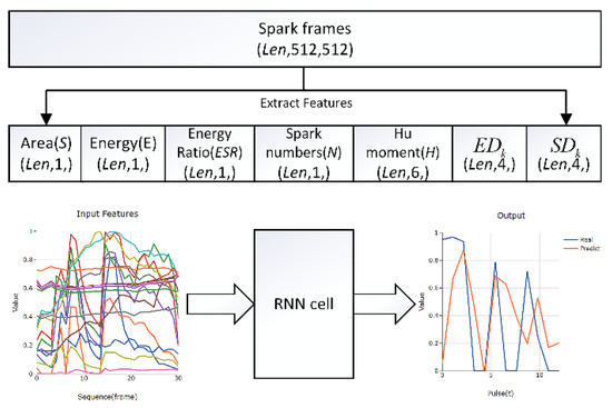 According to the calculation method of the spark features, all of features extracted by the spark frames form into a feature array like (Len,18,1), where Len is the number of spark frames in a process. In Figure 4, the first model proposed in this paper is called as “Sequence to sequence model” which is based on RNN and takes the feature array of serval frames as input and the corresponding labels array as output. The output of RNN depends on several time step data. In other words, RNN can mine the relationship between frames in the spark image or its feature sequence due to the memory function of its network structure [61]. Hence, it can accurately predict the processing states through serval frames of spark images.