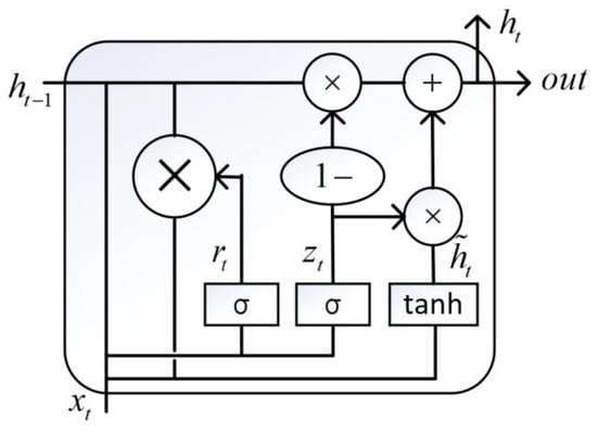 Gated recurrent unit (GRU) is an improvement of traditional RNN which has the advantages of fewer parameters and learning about long-term dependence [63,64]. The struct of GRU is given by Figure 5. Update gate is used to decide whether to pass previous O/P (ht−1) to next cell (as ht) or not. Forget gate is nothing but additional mathematical operations with a new set of weights (Wt). The variables in Figure 5 are updated by the following formula:
