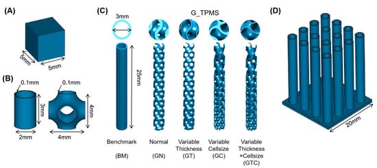 Design models: (A) 5 × 5 × 5 mm3 cube for energy density parameter optimization; (B) 0.1 mm wall-thickness cylinder and 0.1 mm wall-thickness of P-type TPMS samples for parameters optimization of TWS; (C) Different sample design with BM/GN/GT/GC/GTC structures; (D) Pseudoheatsink example design.