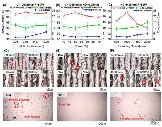 (A–C) The relative density and roughness of cubes with different energy density parameters; (D–F) Top surface morphology of cubes; (G–I) Polished side surface morphology of three process conditions: lack of fusion, dense, overheating.