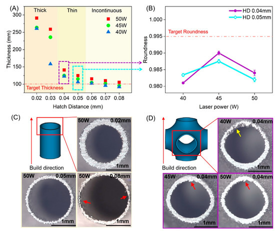 On the other hand, the wall thickness drops to about 100 μm as HD goes up to 0.08 mm. The cross-section morphology of the cylinder can be found in Figure 3C. As observed, the wall appears to be discontinuous when HD is 0.06 mm and above. It is noted that there is an inward offset from the design contour in the hatch area of the laser track as spot compensation. In this work, the spot compensation is set as 0.04 mm, meaning that the contour region on both sides of the wall is 0.04 mm in width. For the 0.1 mm wall-thickness cylinder, there is a hatch region of 0.02 mm width to fill with laser paths. It results in the disappearance of the laser path on some positions in the sliced file when the HD is much more than the width of the hatch region. This lack causes a discontinuous wall structure, as indicated by the red arrow in Figure 3C, which can be found in the specimens printed by HD of 0.06–0.08 mm. However, specimens printed by HD lower than 0.05 mm have no discontinuous wall. It is attributed that the remelting for the previous layer and the hatch angle of 67°, which ensures the coverage of the previously unmelted region path. As a result, at the energy density of 100 J/mm3, HD of 0.04/0.05 mm is the optimal parameter for thin wall thickness.