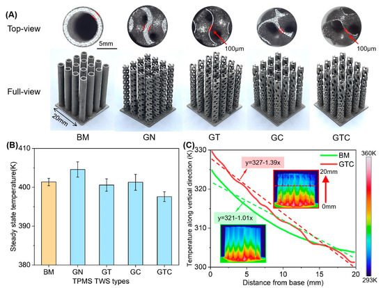 Figure 4 exhibits the result of the fabricated TPMS TWSs and the heat dissipation experiment. In the full view, five types of samples are shown, which are built by the optimal parameters mentioned in the previous section. The top surface can be observed from the top-view figures, in which the wall thickness is measured directly. The thickness of 100 μm is realized in the GT and GTC TWS. In Figure 4B, the base temperature of different samples is plotted to represent the heat dissipation capability of samples.