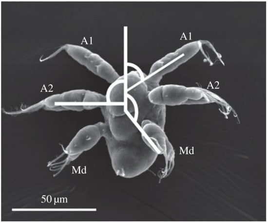 Scanning electron micrograph of a larval copepod, showing three pairs of appendages: First antenna (A1), second antenna (A2), and mandible (Md). Image reproduced from [6] under Creative Commons Attribution 4.0 International License.