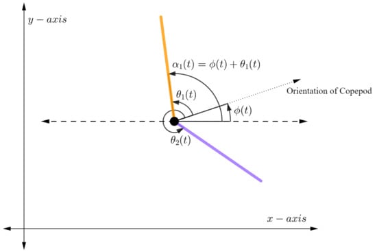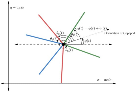 We assume the copepod moves in a plane and possesses 6 independently moving legs, three on each side of the body. The position of the copepod at time t can be described by the vector , where x and y represent the usual Cartesian coordinates on the plane and represents the orientation of the copepod with respect to the positive x-axis. Let denote the angle between the copepod’s orientation and the ith leg, and let denote the angle between the ith leg and the positive x-axis. See Figure 2 for an illustration.