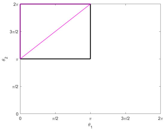 The motion described in Example 1 traces out the pink triangle in the –plane, counter-clockwise from the bottom left vertex. The black box represents the constraint (19).