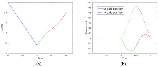 which implies a net rotation of The orientation over time, along with the displacements over time obtained by numerical integration, are shown in Figure 5. The net change in position, equal to the final position, is given by: