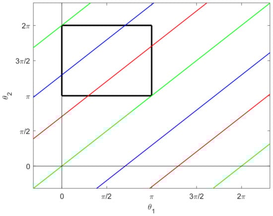 Note that is just the horizontal lift of the naive parametrization of the lines which constitute the connected components of projected to the –plane; these are the colored lines in Figure 6. Thus for any time t we have . The curves are integral curves for and are therefore horizontal. In fact, is the intersection of D and the set of Cauchy characteristics for . It is also the intersection of D with tangent bundle .