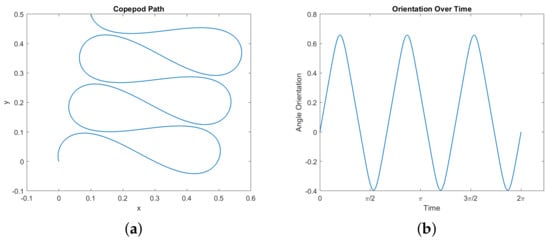 First, certain trajectories seem to show the copepod moving along a curve in the –plane which is a type of Euler elastica. See Figure 7 for one example. In particular, we observe this behavior when fixing the start and end positions in the plane, demanding that the net change in orientation is zero, and demanding that the copepod completes a stroke, with no other imposed boundary conditions. It can be observed that the legs follow a periodic motion, and in turn the orientation of the copepod is periodic as well. The motion in the angular phase plane is a perfect ellipsoid within the constraint space, reflecting the symmetry of the motion of the two legs.
