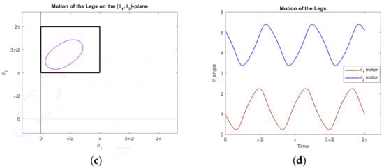 A simulated optimal normal trajectory showing elastica-like motion in the plane. Here we set the following boundary conditions: (x,y)(0) = (0, 0) , (x,y)(2π) = (0.1, 0.5), and (ϕ,θ1,θ2)(0) = (ϕ,θ1,θ2)(2π). The energy here is approximately 54.311. (a) The elastica-like path of the microswimmer in the xy–plane. (b) Orientation θ(t). (c) The trajectory in the θ1,θ2–plane, within the constraint square (19). (d) Angles of the legs θ1(t) and θ2(t).
