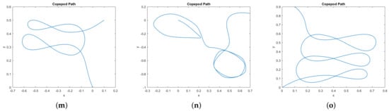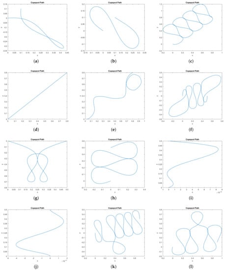 The horizontal lifts of the singular curves in Figure 6 are projections of abnormal curves for the two-legged copepod. They are the integral curves for the vector field restricted to the singular set for the distribution D, and they project to uniform circular motion in the –plane. More precisely, let , and take any and any not both zero. Then the curves and are abnormal, where: