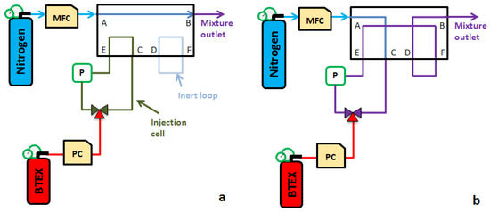 This analogy drove us to build a dilution device from a 6-way 2 position solenoid valve (MTV-6SL-N32UF-1, Takasago Fluidic Systems, Nagoya, Japan) as shown in Figure 1. Indeed, it is possible to create the pulses of a pollutant in a loop isolated from the continuous flow of carrier gas and then purge its content by changing the position of the solenoid valve. However, in the operation presented for liquid chromatography, the sample circulates permanently and thus requires a leak. To avoid this disadvantage, it is possible to transform the open sampling loop into a closed one. This closed loop is called hereafter “injection cell”. The injection of a pollutant into this cell is then performed thanks to a 3-way solenoid valve at 2 positions, where 2 ways are part of the cell, and the third way is connected to a pressurized gas pollutant cylinder of a fixed concentration (see Figure 1).