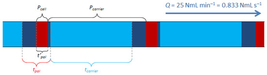 Once the content of the cell has been purged, the 6-way solenoid valve changes position again, allowing pure carrier gas to be generated during a new filling of the cell. Alternating pure carrier gas trains and pollutant-loaded carrier gas trains then make it possible to achieve a second dilution called “time dilution”. The ratio between the pulse duration of a pure carrier gas train and the pulse duration of a carrier gas train loaded with pollutant gives the ratio of this second dilution as established in Equation (1).