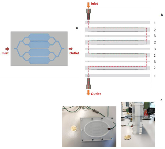 A laboratory prototype of this micromixer was developed and tested as part of this study (Figure 3c). It was made of Poly(methyl methacrylate) (PMMA), a material inert to the pollutants studied, and the patterns were engraved using a micro-milling machine (Roland MDX-40A, Serris, France). The connectors used for the mixer inlet and outlet tubes were 1/16” Polyetheretherketone (PEEK) connectors. Sealing between the stages was ensured by 3 mm diameter Teflon O-rings, inserted into grooves, and compressed with screws passing through the entire mixer.