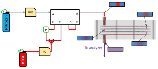 In the absence of the column, the compounds were no longer separated, which made it possible to determine an overall concentration of the BTEX injected by considering that the response factor of these 6 species was similar, as reported in the literature [41]: 0.780 (Benzene); 0.794 (Toluene); 0.818 (Ethylbenzene); 0.812 (m, p-Xylenes); 0.840 (o-Xylene). This assumption was verified experimentally later since the total concentration generated was close to the targeted one.