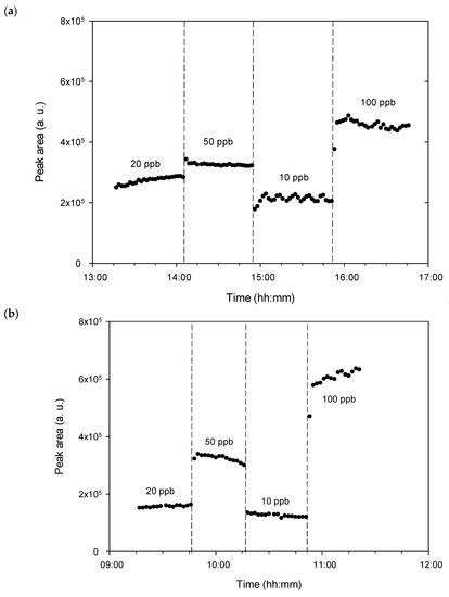 New tests were then performed with the new configuration with a lower dead volume, generating BTEX mixtures at 20, 50, 10, and 100 ppb, consecutively (Figure 6a). A significant improvement in the response time was then observed, since the latter was reduced down to 4 min. On the other hand, the stability of the concentration was not ensured, the concentration of 10 ppb presenting a significant variation in concentration over time. The maximum and minimum areas obtained for this concentration of 10 ppb from each of the BTEX were equal to 2.29 × 105 a.u. and 2.05 × 105 a.u., respectively, which represented a variation of about 10%.