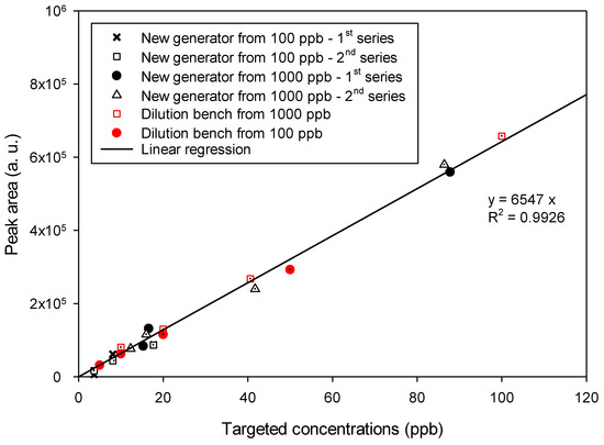 Figure 7 groups together all the results obtained from the different series of measurements made with two different BTEX cylinders at 100 or 1000 ppb respectively combined with the dilution bench or the new generation source equipped with the micromixer. The peak area of total BTEX increased perfectly linearly with the concentration of BTEX in the range 3.7–100 ppb, the linear regression of the dataset allowed to obtain a straight line with a coefficient of determination R2 = 0.993. In addition, the data obtained with the new generation source agreed perfectly with those obtained by the reference method, namely the dilution bench.