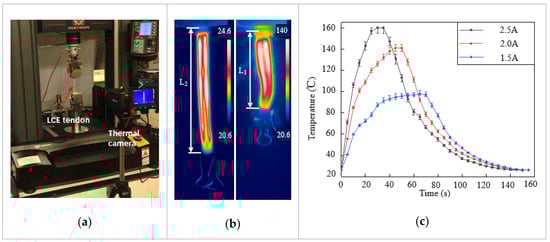 The LCE tendon was characterized using an Instron mechanical testing system (MTS), and a thermal camera (FLIR-T630) was placed nearby to record the temperature change and actuation strain, as shown in Figure 2a. A current generator was used to supply constant and stable electric current to the LM heating element. Joule heating led to phase transformation and contraction of the LCE tendon. In the first characterization, in order to measure the contraction strain in the LCE tendon, one end of the LCE tendon was fixed on the clamp while the other end was kept free. When enough current passed through the LM heating element, temperature increase caused the LCE tendon to shrink freely from the programming length L1 to the original length L2, as shown in Figure 2b and Video S1. The thermal camera recorded both the actuation strain and temperature distribution on the surface of the LCE tendon. In the experiment, three different current values were supplied: 1.5 A, 2 A, and 2.5 A, and at least three tests were carried out for each current. The temperature in LCE tendon versus time for three currents is presented in Figure 2c, which shows the maximum temperatures that can be reached for each current, and the time required to reach the maximum temperature. For 1.5 A, 2 A and 2.5 A currents, the maximum temperatures that can be reached are 98 °C, 141 °C, and 160 °C, and the times required to reach these temperatures are 65 s, 50 s, and 30 s, respectively. The current was then cut off after the LCEs reached the maximum temperatures. The cooling of LCE tendons after heating was similar for the three different currents. Figure 2d exhibits the maximum contraction strain in each sample versus the supplied current. The average contraction strain increases from 26.5% at 1.5 A, to 40% at 2.0 A and 43.6% at 2.5 A. This clearly demonstrates the effect of increasing current on increasing the contraction strain of the LCE tendon in a shorter time.