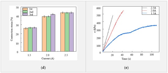 A second characterization was carried out with both ends of the LCE tendon fixed on the clamps of the MTS. When electric current was supplied to the LM heating element, temperature increase-induced LCE contraction was prevented by the MTS clamps, and the contraction force/stress was recorded by the MTS. The contraction stress versus heating time for the three different currents is shown in Figure 2e. When the current increased from 1.5 A to 2 A, the maximum stress increased from 352 kPa to 546 kPa, and the time required to reach the maximum stress decreased from 109 s to 42 s. Further increasing the current to 2.5 A meant that the time required to reach maximum stress decreased to 21 s, but the maximum stress that could be reached decreased to 483 kPa. This is because a vast amount of heat was generated at 2.5 A, leading to debonding of the VHB layer with LCE, as well as localized polymer burning of the LCE artificial muscle.