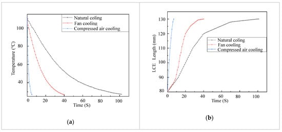 Figure 4. LCE tendon surface temperature drop (a) and extension (b) versus time using different cooling methods.