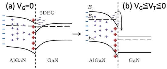 The most commonly used GaN HEMT is an AlGaN/GaN heterostructure. The typical thickness of AlGaN is around 20–25 nm, and the thickness of the GaN channel and buffer layer is around 1–5 µm depending on the requirement of the breakdown voltage [15]. According to the energy band structure of the GaN HEMT, there is a potential energy well at the junction of AlGaN and GaN, and there will be a transportable energy state formed by the accumulation of electrons in this energy well, as shown in Figure 3 [17,19]. Figure 3a shows the charge accumulated in the potential well as VG = 0, and Figure 3b indicates that the accumulated charges are depleted with VG < VT < 0.