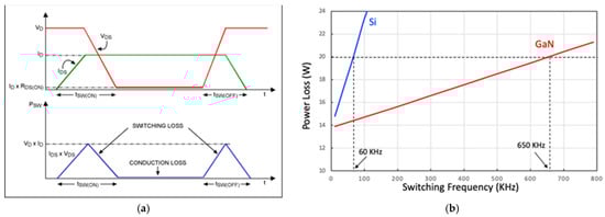 (a) Relation between switching speed and energy loss for a power switch, and (b) the lower power loss of GaN compared with Si [40]. Figure reproduced with permission from IEEE 2016 10th International Conference on Compatibility, Power Electronics and Power Engineering.