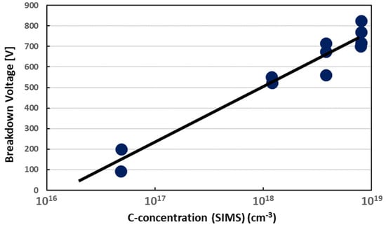 The design and growth of buffer layers are very critical. The characteristics of the GaN HEMT, especially the breakdown voltage, are affected by the quality and resistivity of the underlying buffer layer. The GaN buffer layer under the channel needs higher resistivity to prevent the DC leakage current and AC coupling. Since undoped GaN is typically n-type, adding a p-type dopant is required to obtain a highly resistive buffer. A commonly used p-type dopant is Mg; however, the memory effect of Mg is very strong [50], and it will affect the properties of the subsequent AlGaN/GaN epitaxy. Thus far, Fe and carbon are used as p-type dopants for the buffer layer. However, Fe dopants still have the issue of a memory effect on the MOCVD growth, and it is not easy to obtain an abrupt interface [51,52]. Carbon is a more attractive p-type dopant for the buffer layer. It does not have a strong memory effect, and its concentration and the breakdown voltage of the buffer layer can be adjusted by changing the epitaxial conditions, as shown in Figure 7 [53,54]. On the other hand, a buffer layer has to be designed to release stress and make the surface flat. Typical structures include a graded AlGaN buffer [55], a GaN/AlGaN superlattice buffer [56], low-T GaN, or low-T GaN with an AlN insertion [57]. For the growth of GaN on Si substrates, AlN nucleation and a buffer layer have to be grown to avoid interaction between Ga and Si at high growth temperatures.