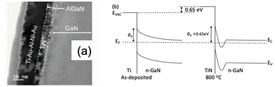 The role of Ti/Al diffusion-type ohmic contact metals in the process of reducing the interface energy barrier is explained by several studies in the literature [61,62,63,64]. When rapid thermal annealing (RTA) is used, and the maximum temperature is raised to above 800 °C, Ti/Al can diffuse into the GaN layer and form a uniform TiAlN alloy. The process can cause nitrogen vacancies to be generated in the crystal lattice. Nitrogen vacancies in GaN act as the n-type dopants to enhance the n-type characteristics of GaN to further reduce the resistance. Figure 9a shows the TEM images formed by annealing a Ti/Au/Al/Ni/Au ohmic contact metal at 850 °C [63]. Figure 9b exhibits the effect of N vacancy formation on the interfacial band structure of GaN [65].