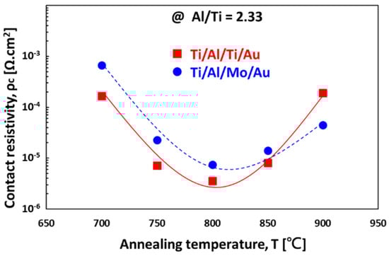 As shown in Figure 10, the contact resistivity of GaN can reach 5 × 10−6 Ω cm2 after annealing a Ti/Al-based (Ti/Al = 0.43) ohmic contact metal at 800 °C [66]. The effect of the ratio of Ti and Al thicknesses is also discussed in the literature [67]. By summarizing the studies from many research works, it can be shown that Ti/Al ohmic contact metals are, thus far, the most stable ohmic contacts for n-type GaN, and the major factors that affect the contact resistances are the Ti/Al ratio and the annealing conditions. As long as the top conductive Au metal is well separated from the Ti/Al layer by a diffusion barrier, the contact resistivity is not affected by the Au conductive layer [66,67].