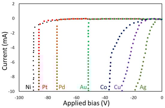IV characteristic diagram of different metals under reverse bias [68]. (Data from [68]).