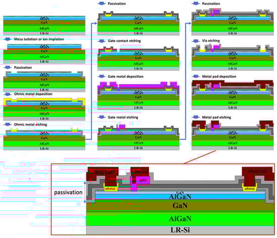 - Huang, T.; Liu, C.; Bergsten, J.; Jiang, H.; Lau, K.M.; Rorsman, N. Fabrication and improved performance of AlGaN/GaN HEMTs with regrown ohmic contacts and passivation-first process. In Proceedings of the 2016 Compound Semiconductor Week (CSW) [Includes 28th International Conference on Indium Phosphide & Related Materials (IPRM) & 43rd International Symposium on Compound Semiconductors (ISCS), Toyama, Japan, 26–30 June 2016; pp. 1–2. [Google Scholar]
