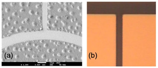 Traditional III–V devices mostly use Au-based metallization schemes that are incompatible with CMOS. The commonly used Ti/Al/Ni/Au ohmic contact metal for GaN can be replaced by an MOS-compatible metal stack such as Ti/Al/Ti/TiN. A Au-based Ti/Al/Ni/Au ohmic contact metal after high-temperature rapid thermal annealing (800~900 °C) usually shows a rough surface roughness, as shown in Figure 13a. After high-temperature annealing, the upper Au layer and Al will react and form a rough surface [75]. The rough ohmic metal surface may affect lithography alignment and subsequent integration. As shown in Figure 13b, the Au-free Ti/Al/Ti/TiN ohmic metal still shows a smooth surface and exhibits low contact resistivity of 1 × 10−5 Ω cm2 after 950 °C high-temperature annealing.
