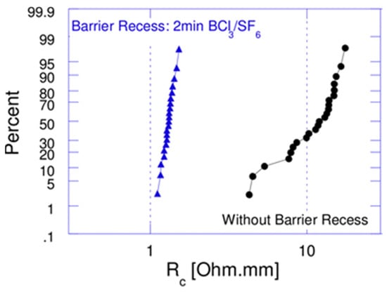 In addition, the formation of ohmic contacts to GaN usually relies on metal diffusion to form a nitrogen vacancy-rich heavily n-doped interface, as described in Section 2.2. However, the diffusion of an ohmic metal through the AlGaN barrier layer requires annealing at a relatively high temperature (>800 °C). One method to reduce the alloying temperature is to perform the AlGaN recess etch at the ohmic contact area before the Ti/Al ohmic metal is deposited. Figure 14 shows the Rc reduction of a device with an AlGaN recess etched at the ohmic region [72], and the Ti/Al/Ti/TiN ohmic contact metal alloyed at 550 °C exhibits excellent contact resistivity.